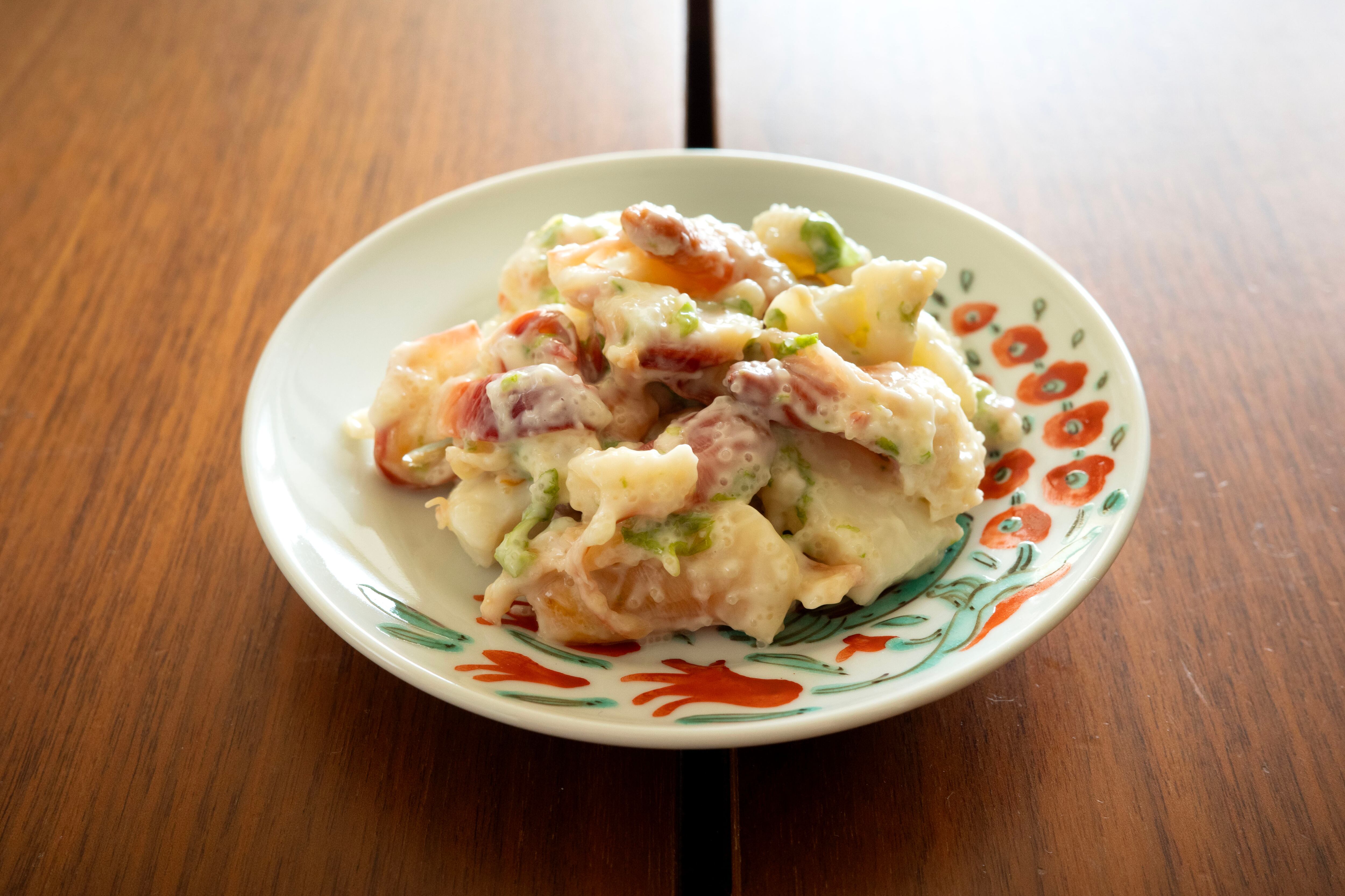 カナダホッキ貝ひも(カナダ産)、あかいか、調味液(水あめ、食塩、米発酵調味料、その他)、半固体状ドレッシング、にしんの卵、醤油、砂糖、発酵調味料、食塩、ヒトエグサ、ホタテ貝エキス調味料、ガーリックパウダー、/ソルビトール、調味料(アミノ酸等)、増粘剤(加工でん粉、増粘多糖類)、酒精、pH調整剤、香辛料抽出物、(一部に小麦・卵・乳成分・いか・さば・大豆・りんご・ゼラチンを含む)