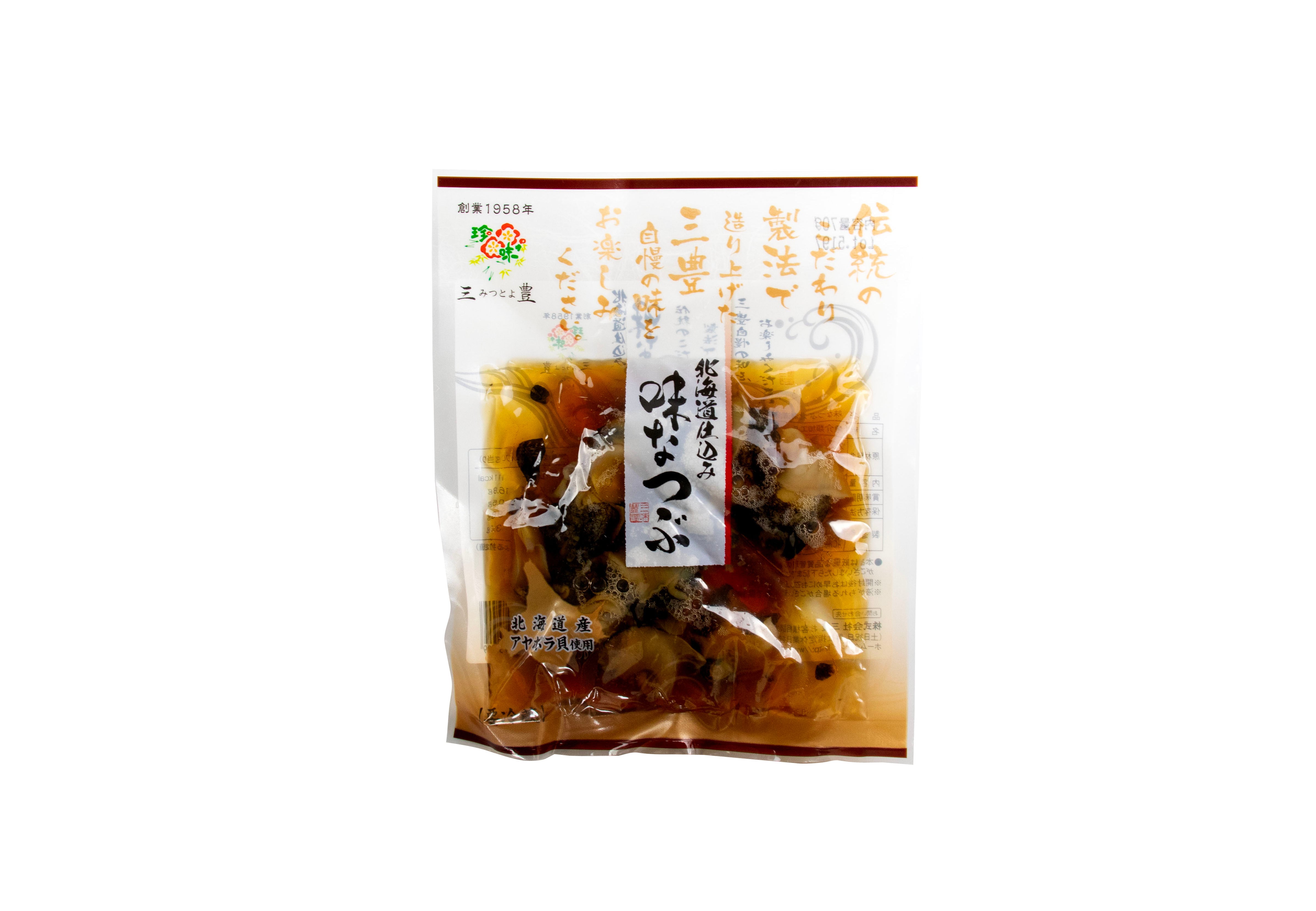 ツブ(アヤボラ(北海道))、還元でん粉糖化物、しょうゆ、みりん、昆布エキス、砂糖、かつお節エキス、麦芽糖/調味料(アミノ酸等)、(一部に小麦、大豆を含む)