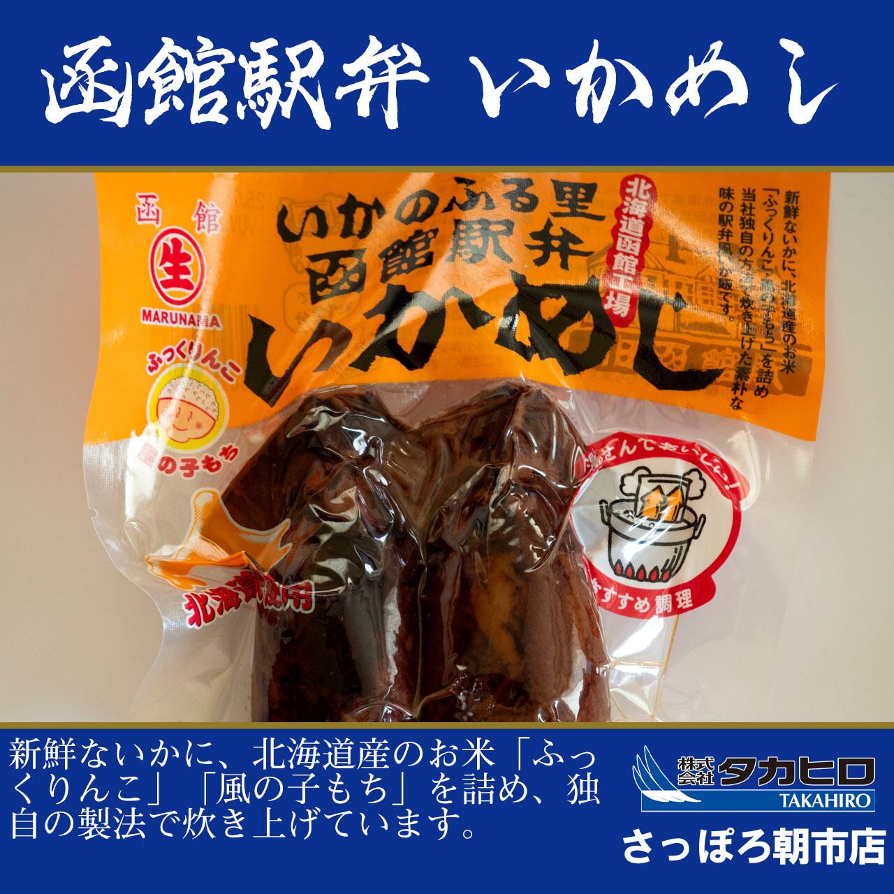 新鮮ないかに、北海道産のお米「ふっくりんこ」「風の子もち」を詰めて、独自の製法で炊き上げています。昔より親しまれている函館名物のいかめしです。湯煎又は電子レンジで温めて簡単にお召し上がりいただけます。