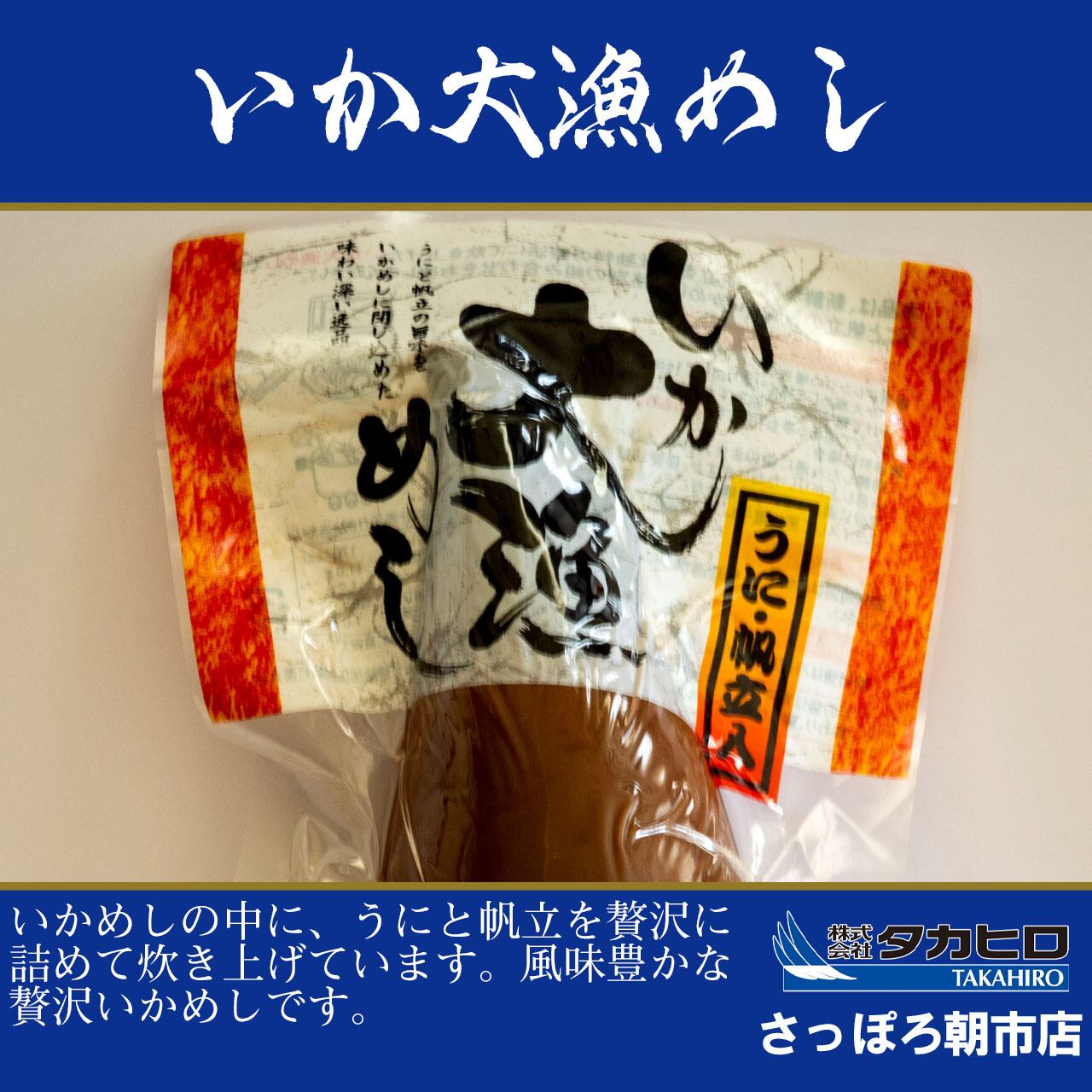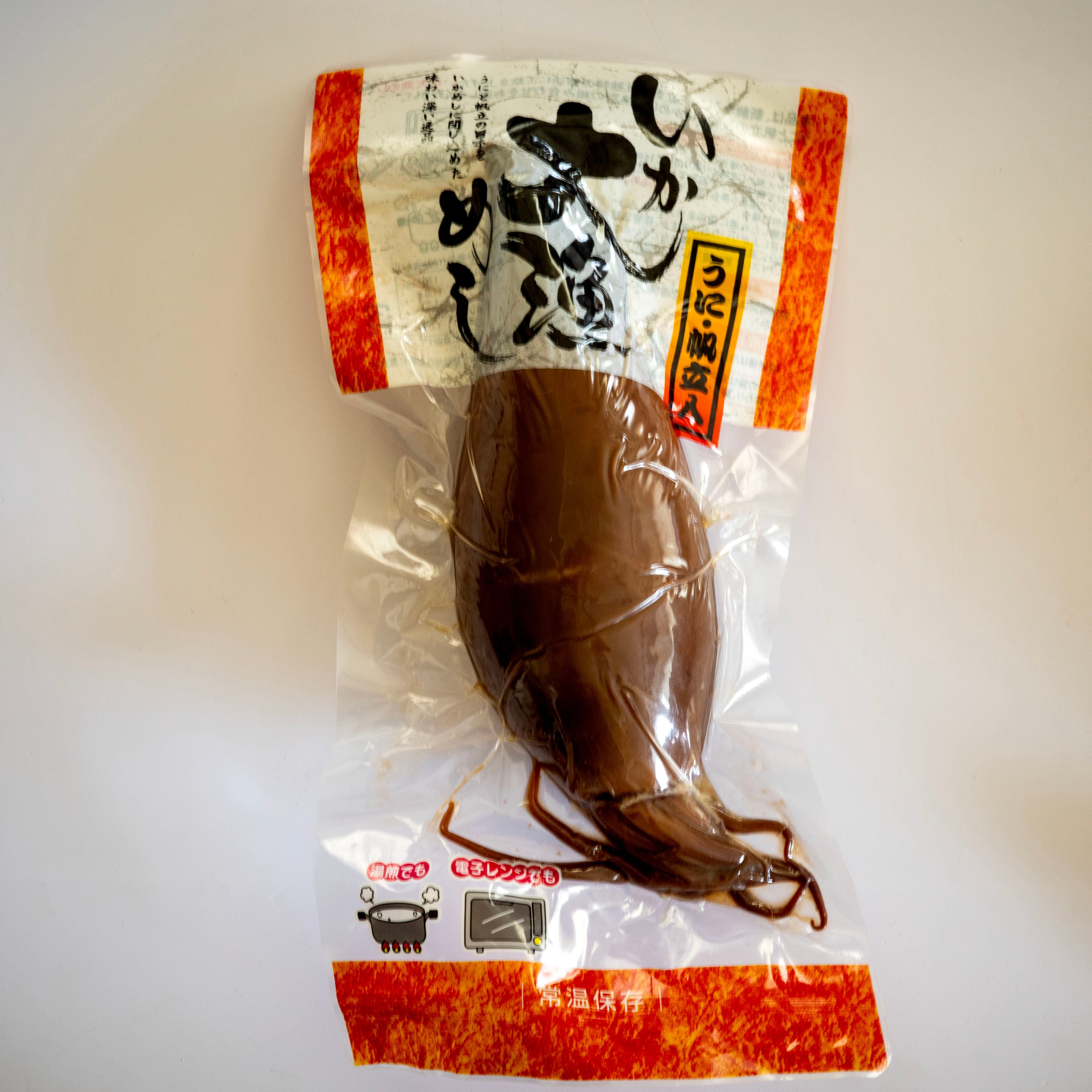 いかの中に北海道産の米ともち米、うに、帆立を詰めて独自の製法で炊き上げた、ジャンボサイズのいかめしです。うに・帆立・いかの風味と絶妙な味付がたまらなく美味。豪華ないかめしです。